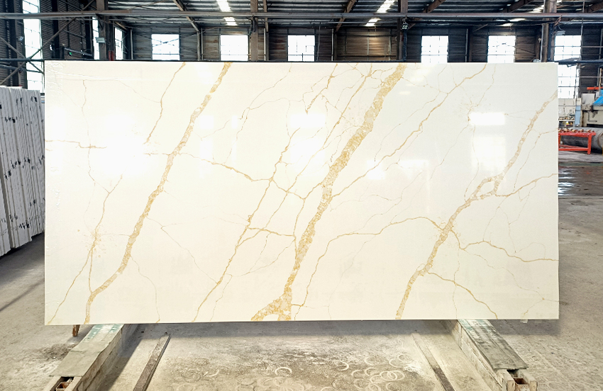 在中东地区的家装市场,石界的金纹石英石大板正掀起一股热销风潮。这款以纯净白为底色、搭配流动金纹的产品,精准契合了当地消费者对高端质感与家居美学的双重追求。