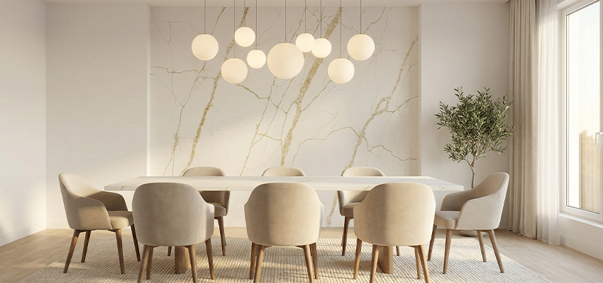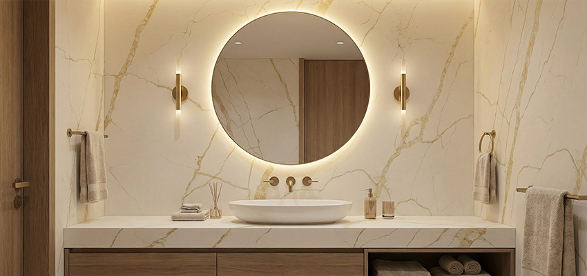 石界金纹石英石大板的走红,首先源于其对中东审美的深度洞察。底色的纯净白适配当地炎热干燥的气候,带来视觉清凉感。而金色纹理则呼应了中东文化中对尊贵、奢华的偏爱,无论是嵌入别墅岛台,还是作为橱柜面板,都能让空间瞬间焕发出雅致又高级的格调。